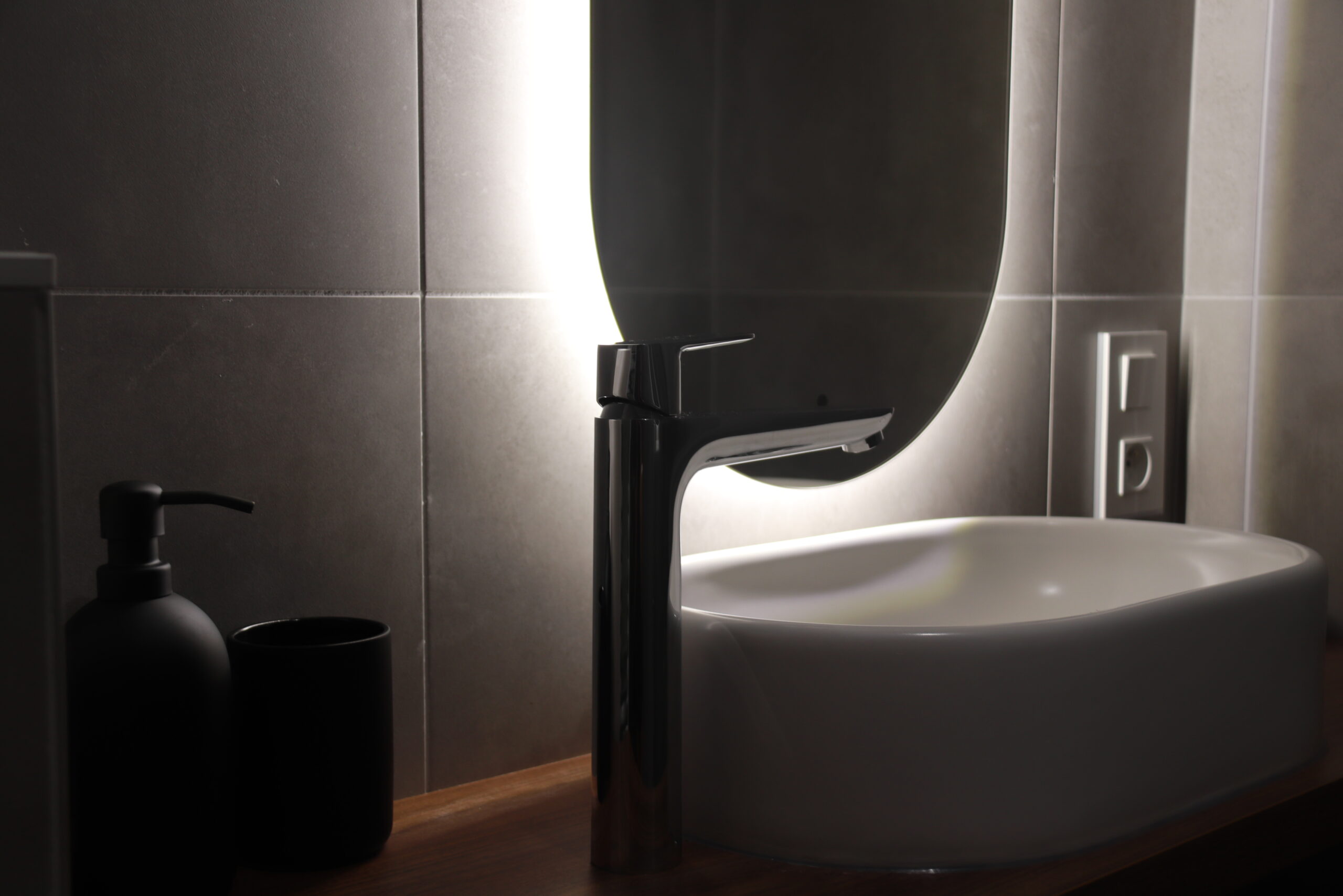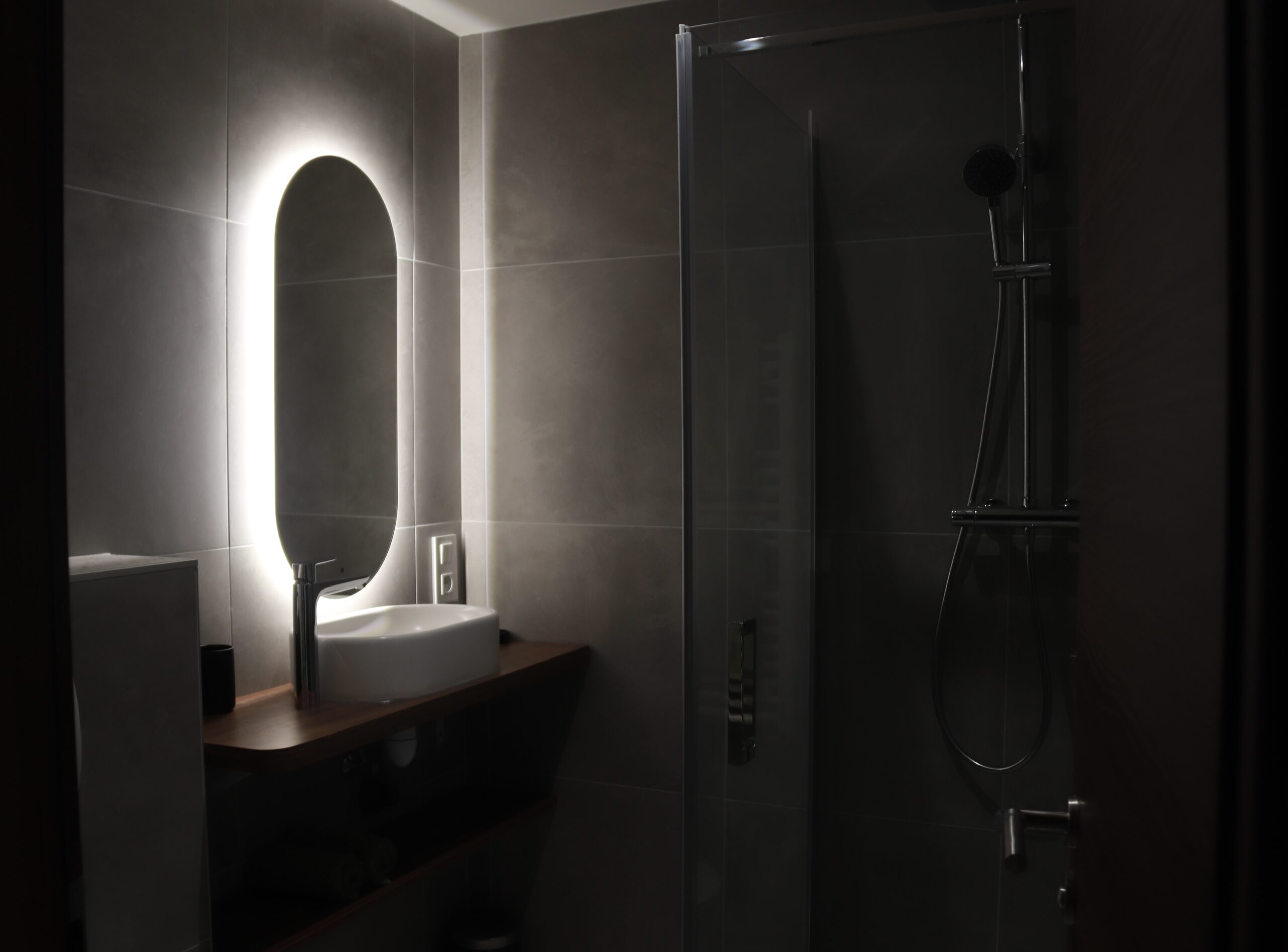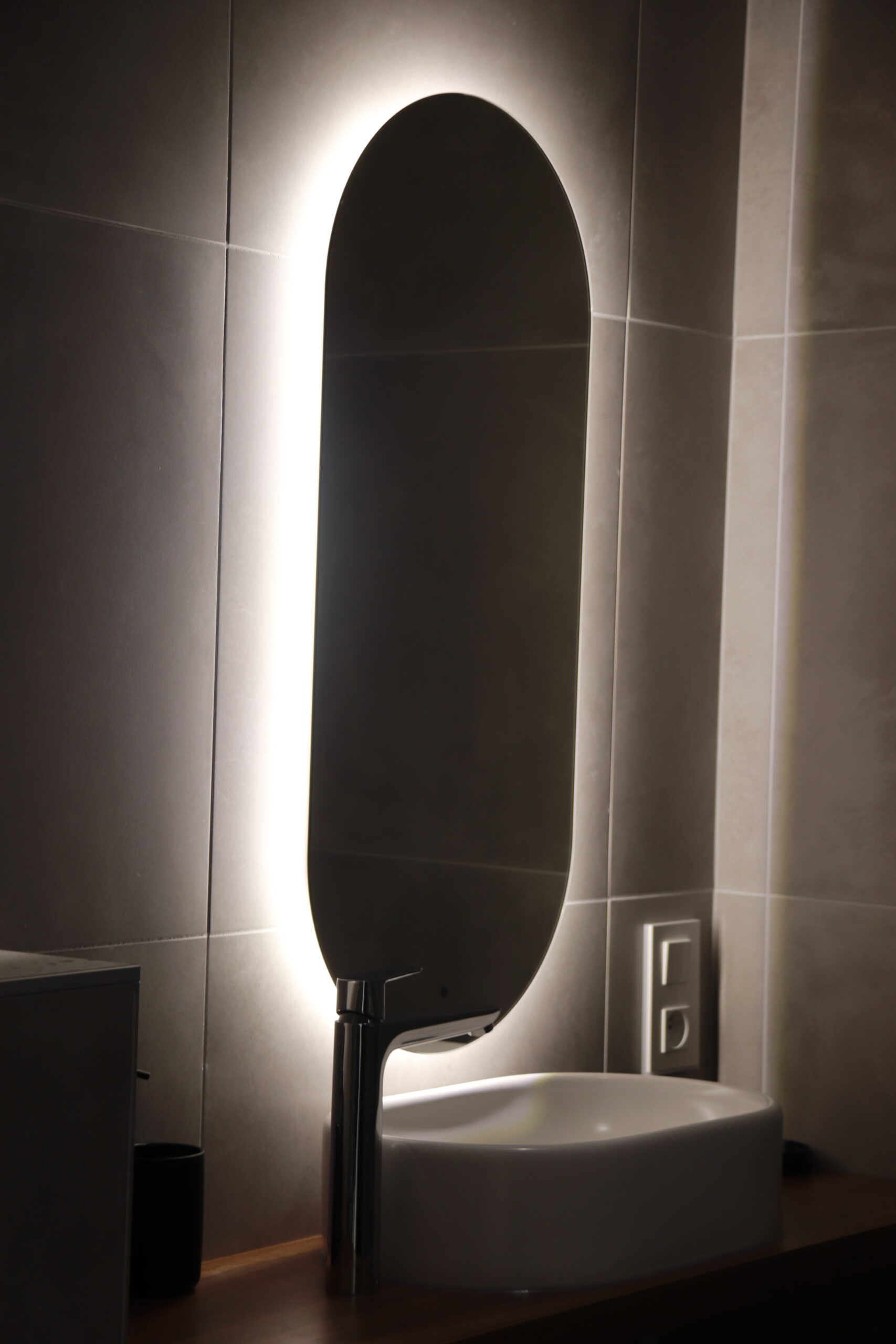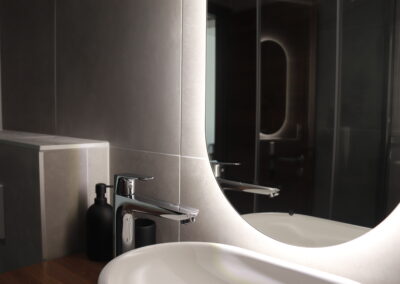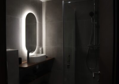La salle de bain, résolument moderne, prolonge cette recherche d’équilibre. L’alliance se traduit par les formes oblongues de la vasque et du miroir, qui dialoguent avec douceur et apportent une touche raffinée et intemporelle.
