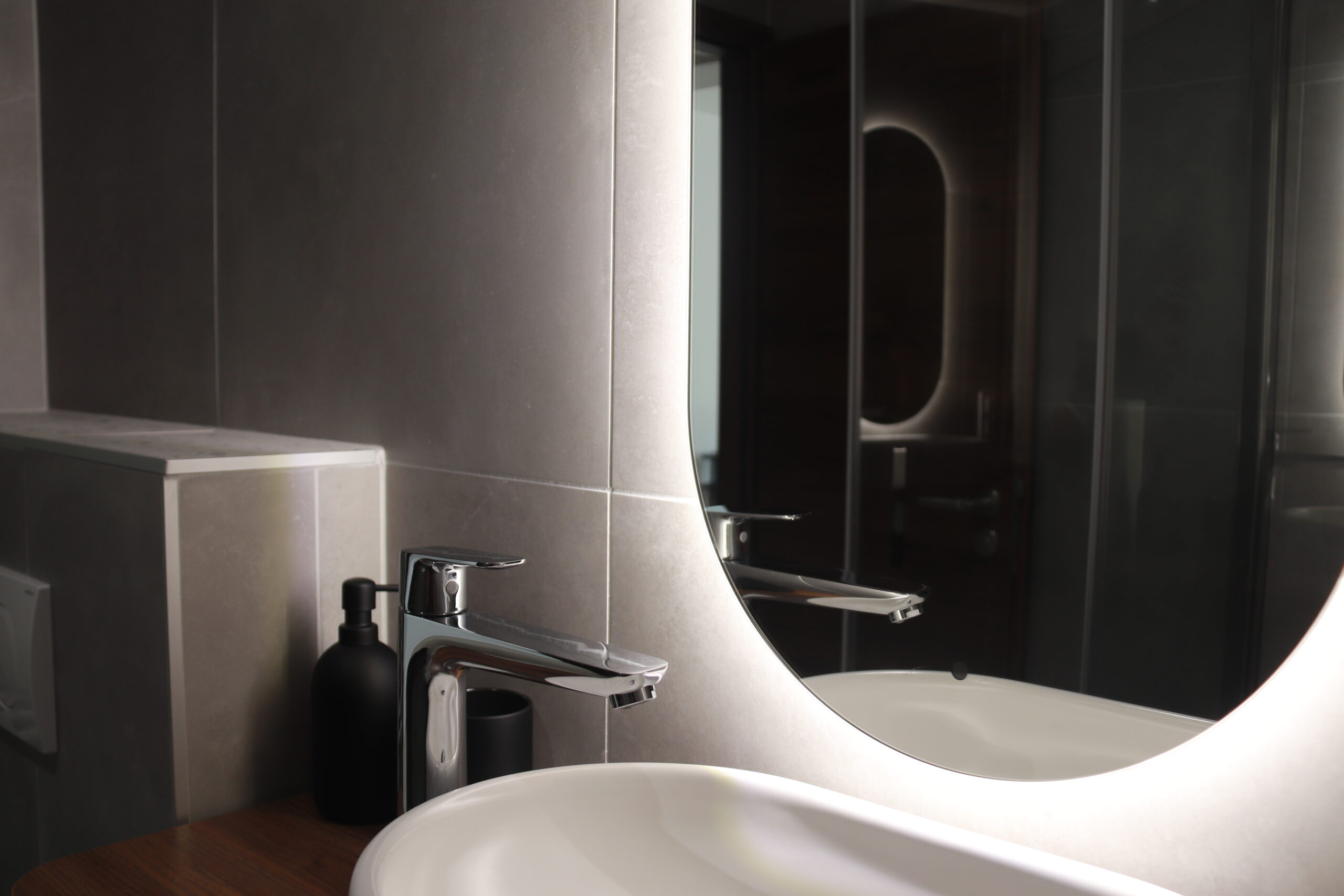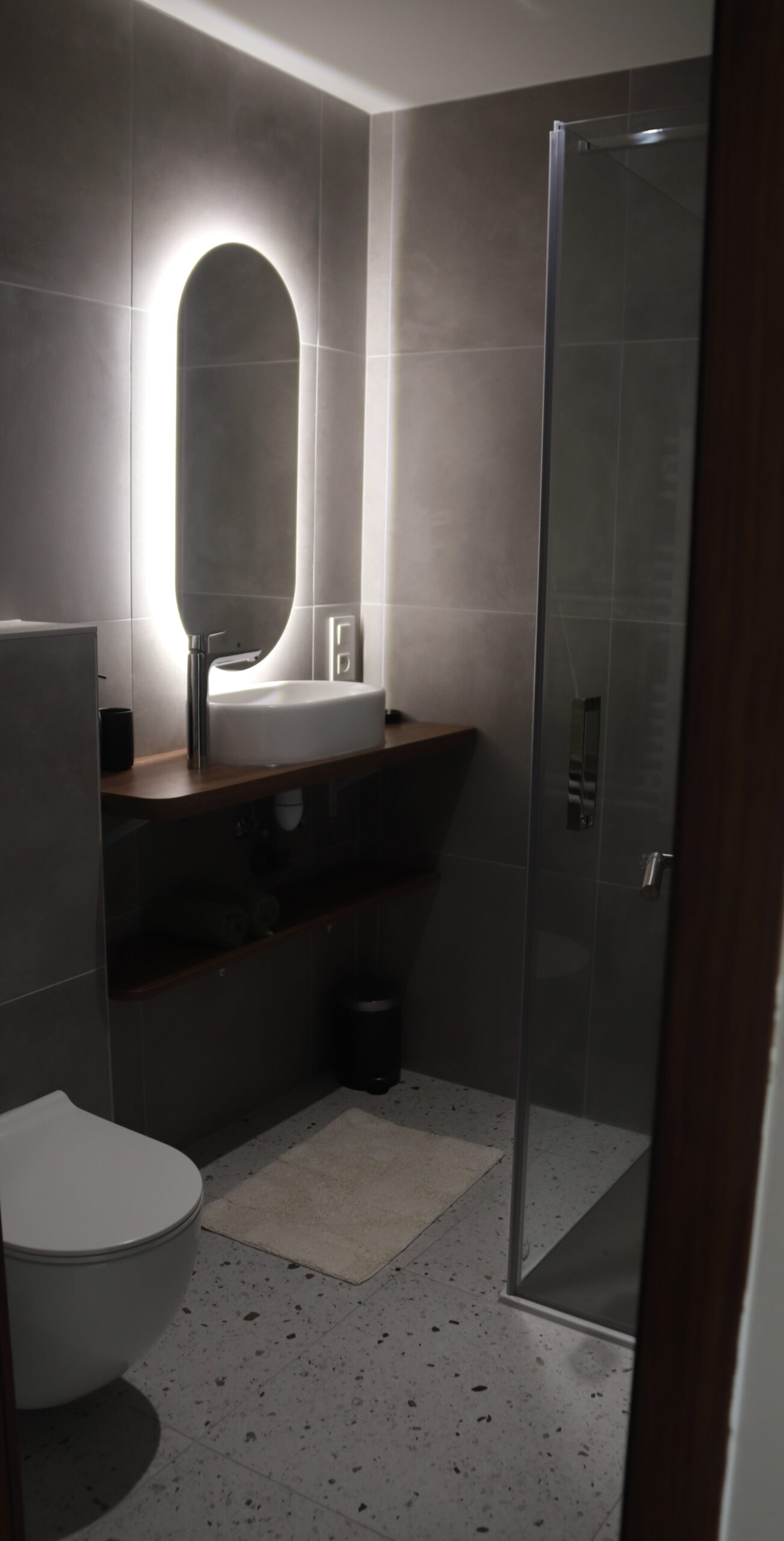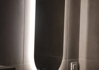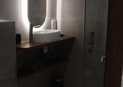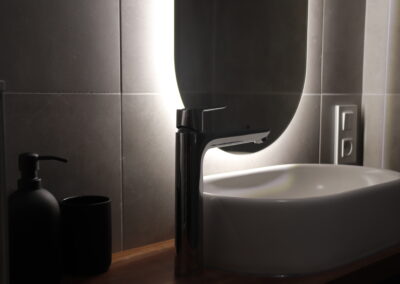 La salle de bain, résolument moderne, prolonge cette recherche d’équilibre. L’alliance se traduit par les formes oblongues de la vasque et du miroir, qui dialoguent avec douceur et apportent une touche raffinée et intemporelle.