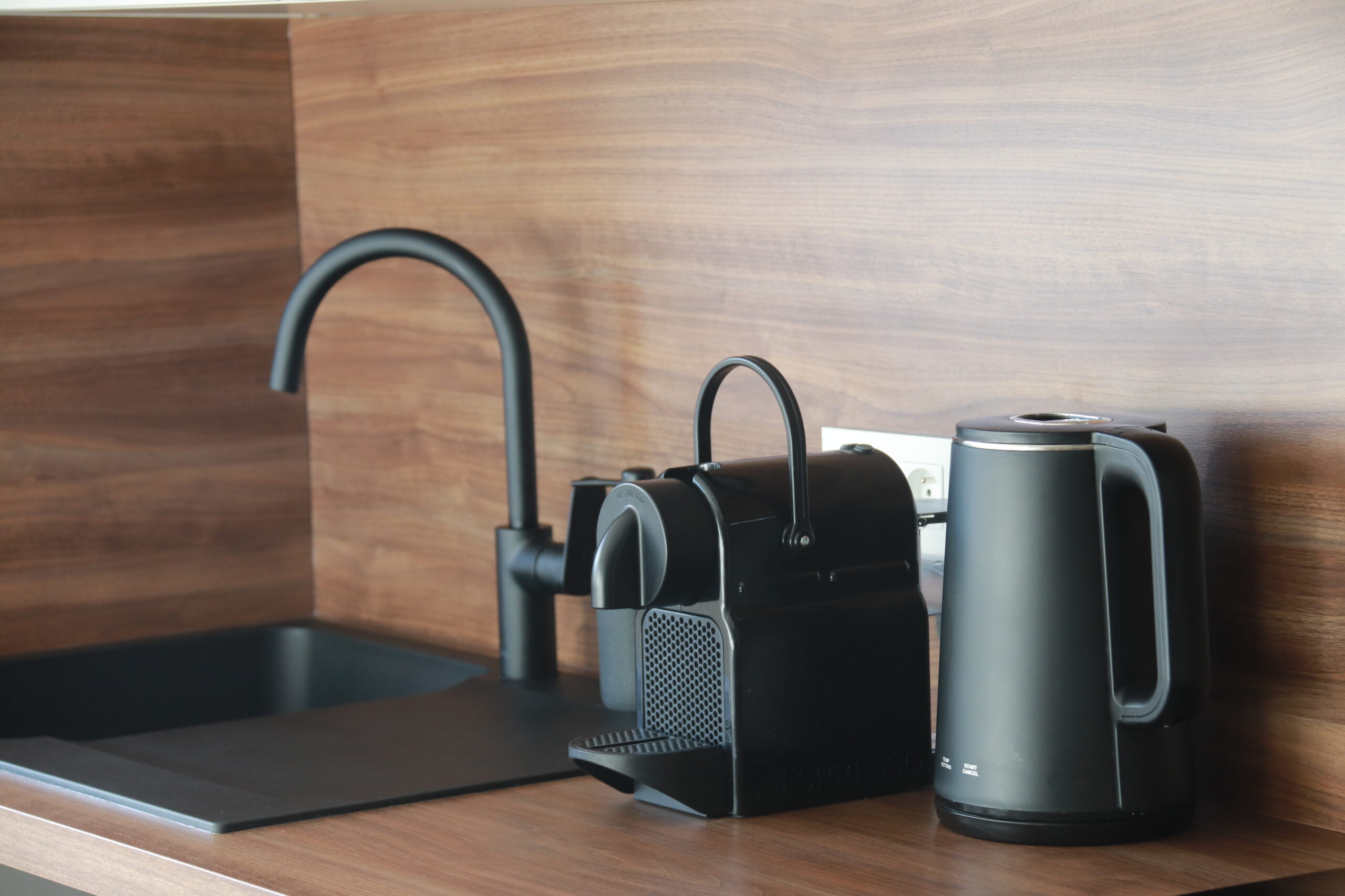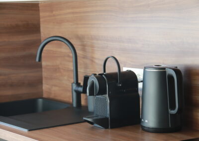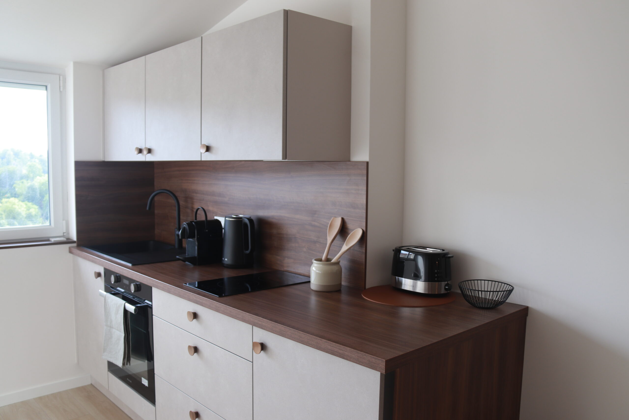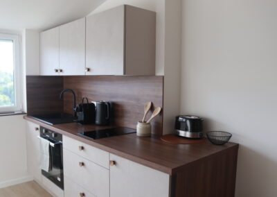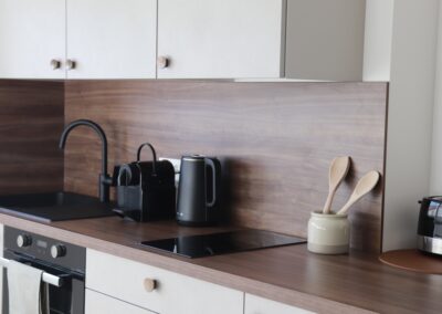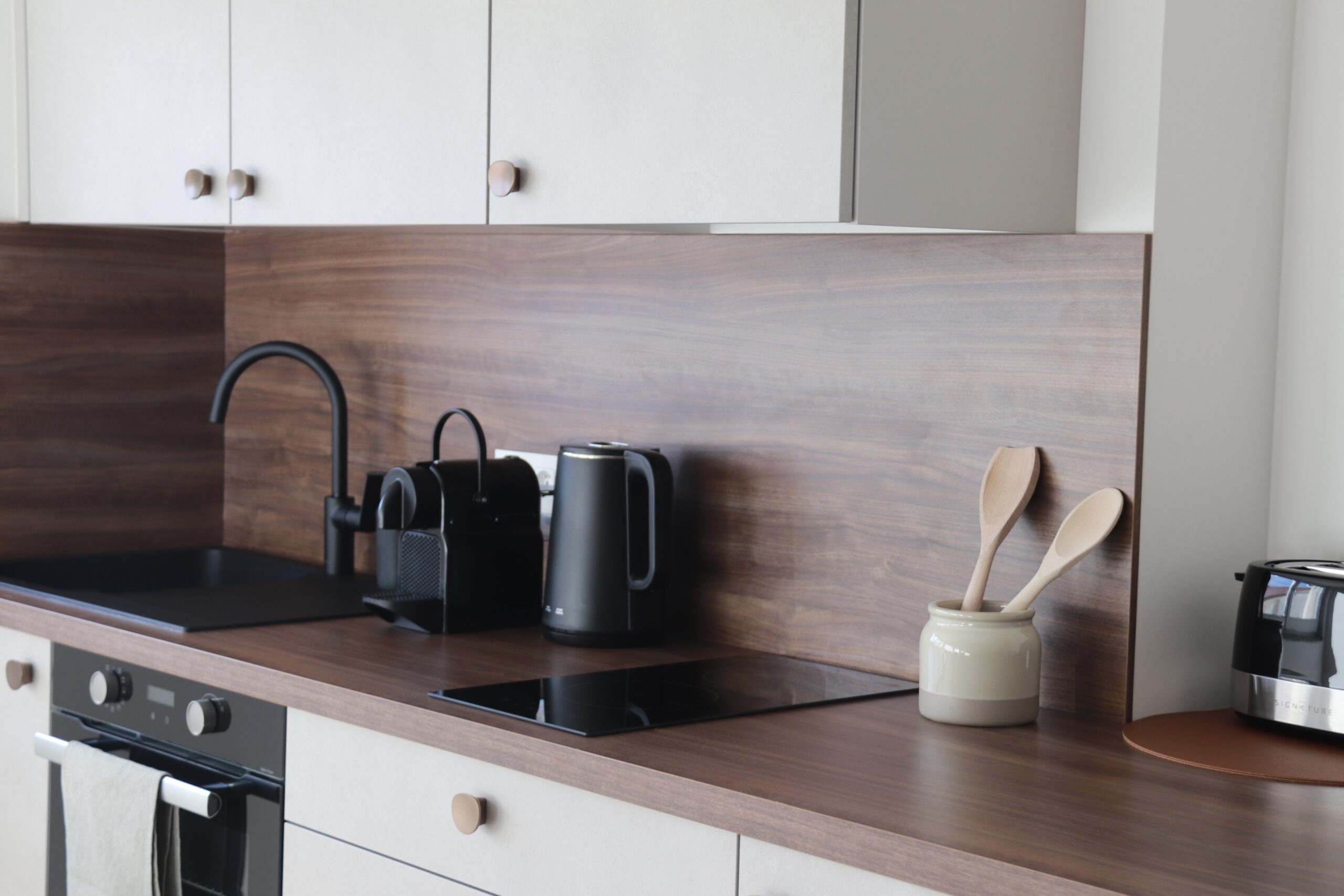 Ouverte sur le salon, la cuisine mise sur la clarté de ses façades. Le plan de travail effet noyer s’accorde à la crédence assortie, créant une atmosphère conviviale et soulignant l’espace culinaire. La robinetterie noire mate apporte une touche contemporaine et subtilement contrastée.
